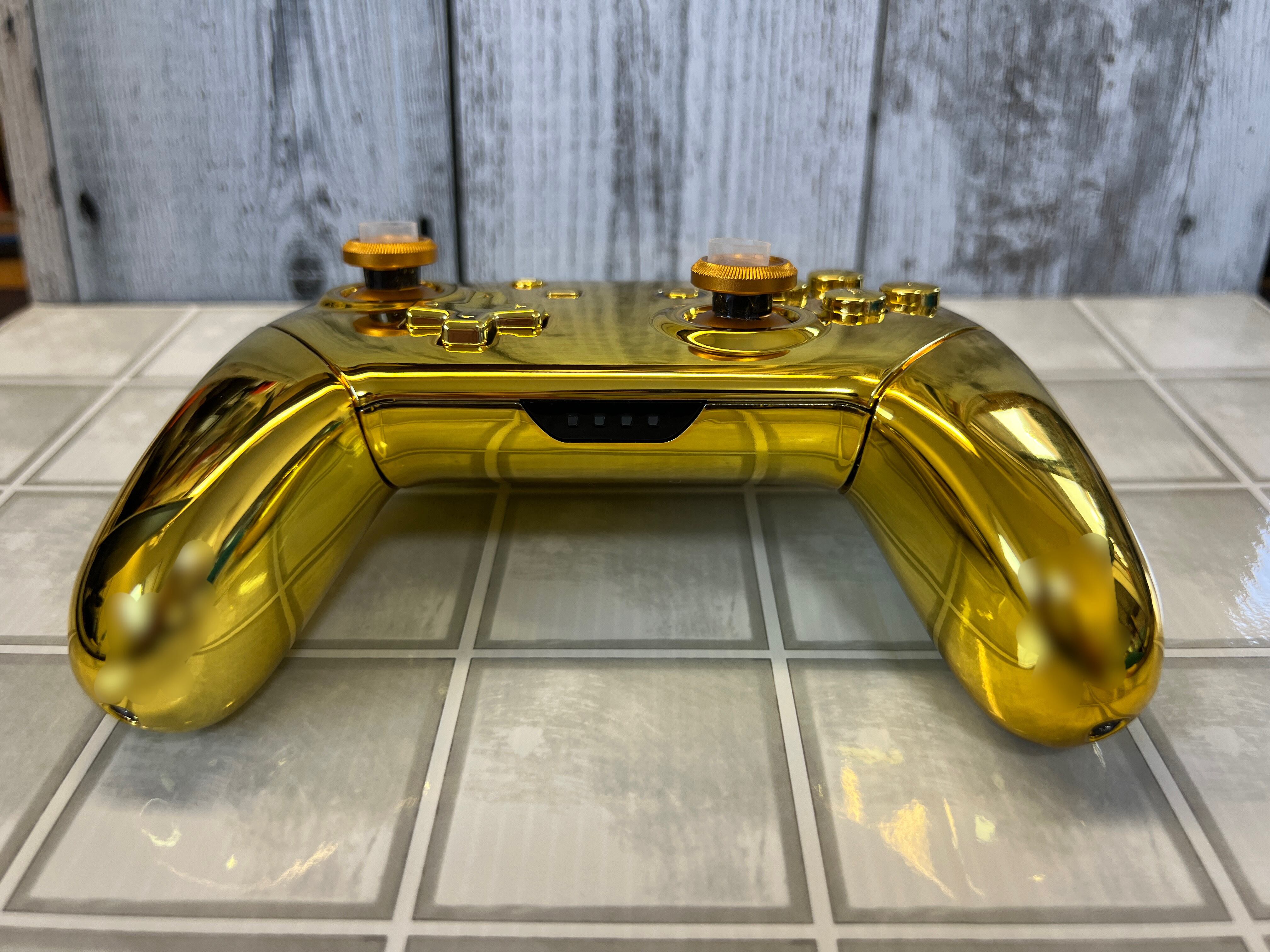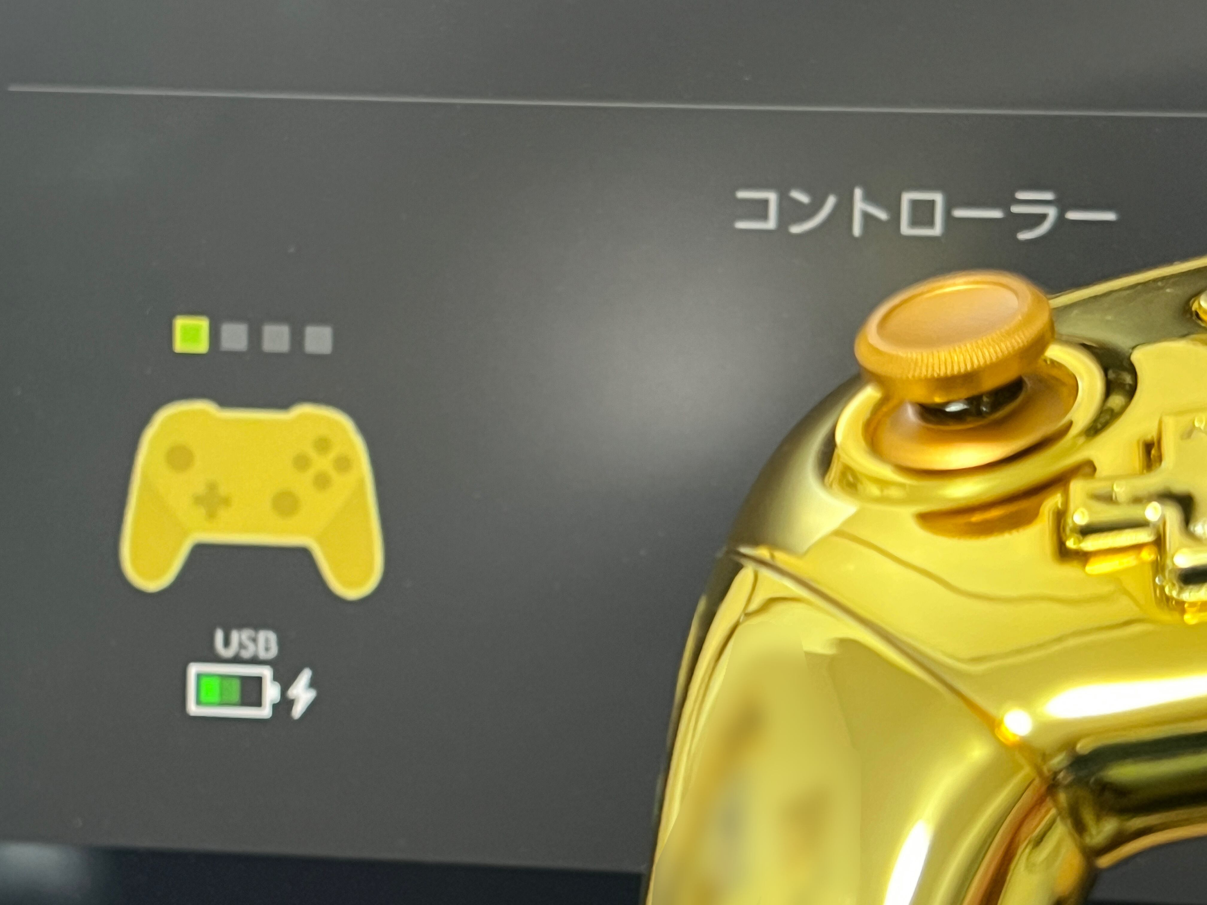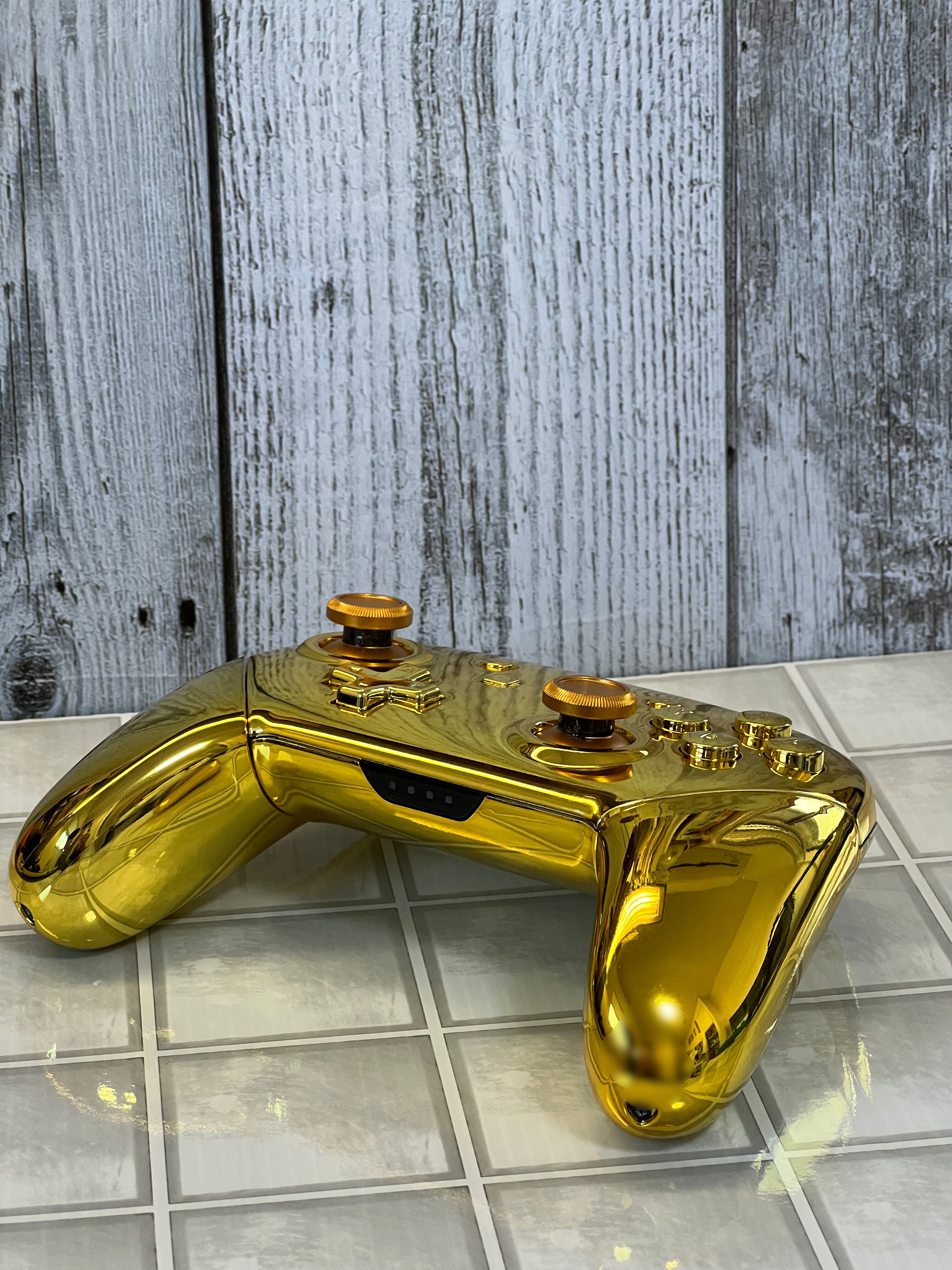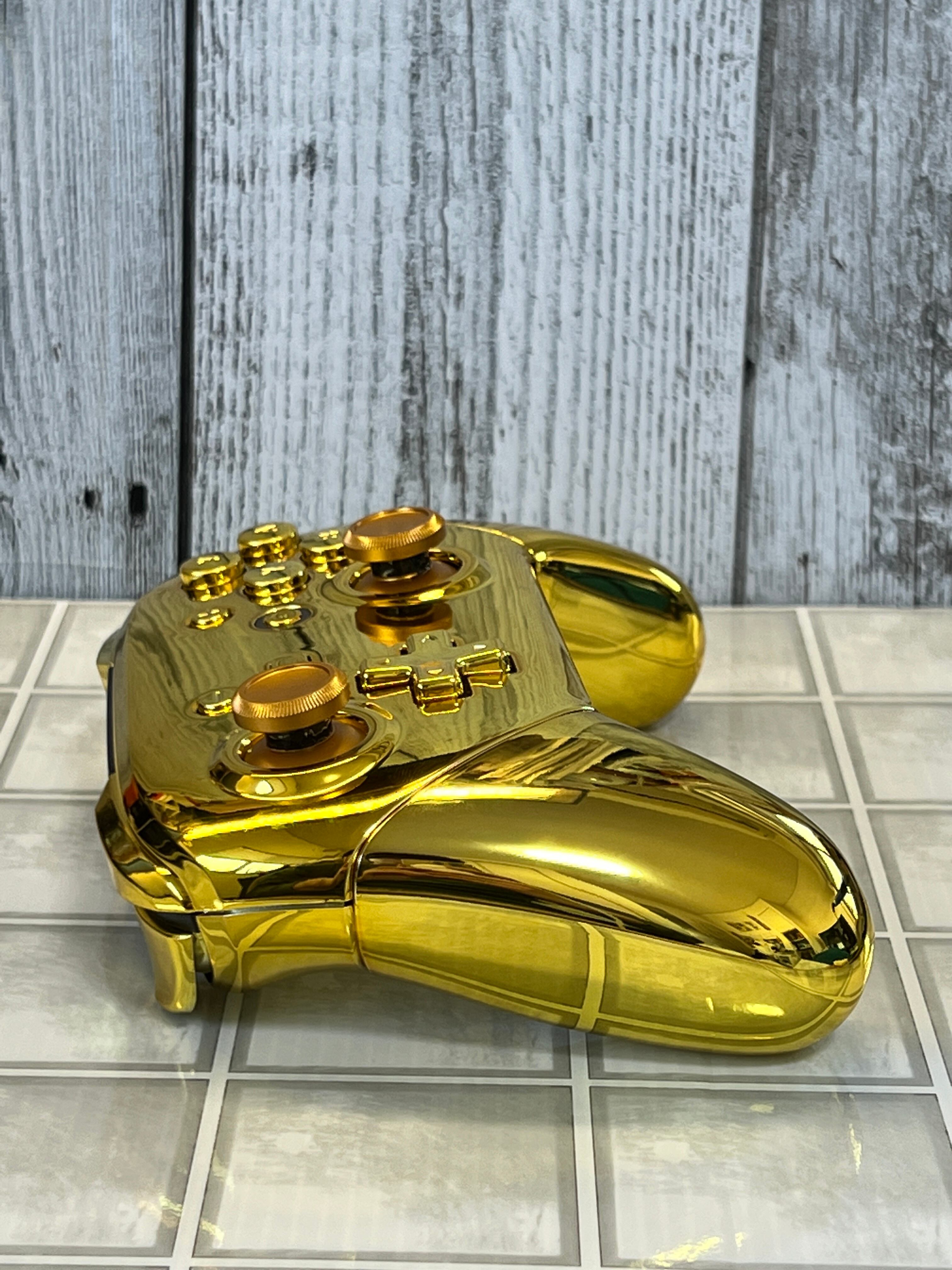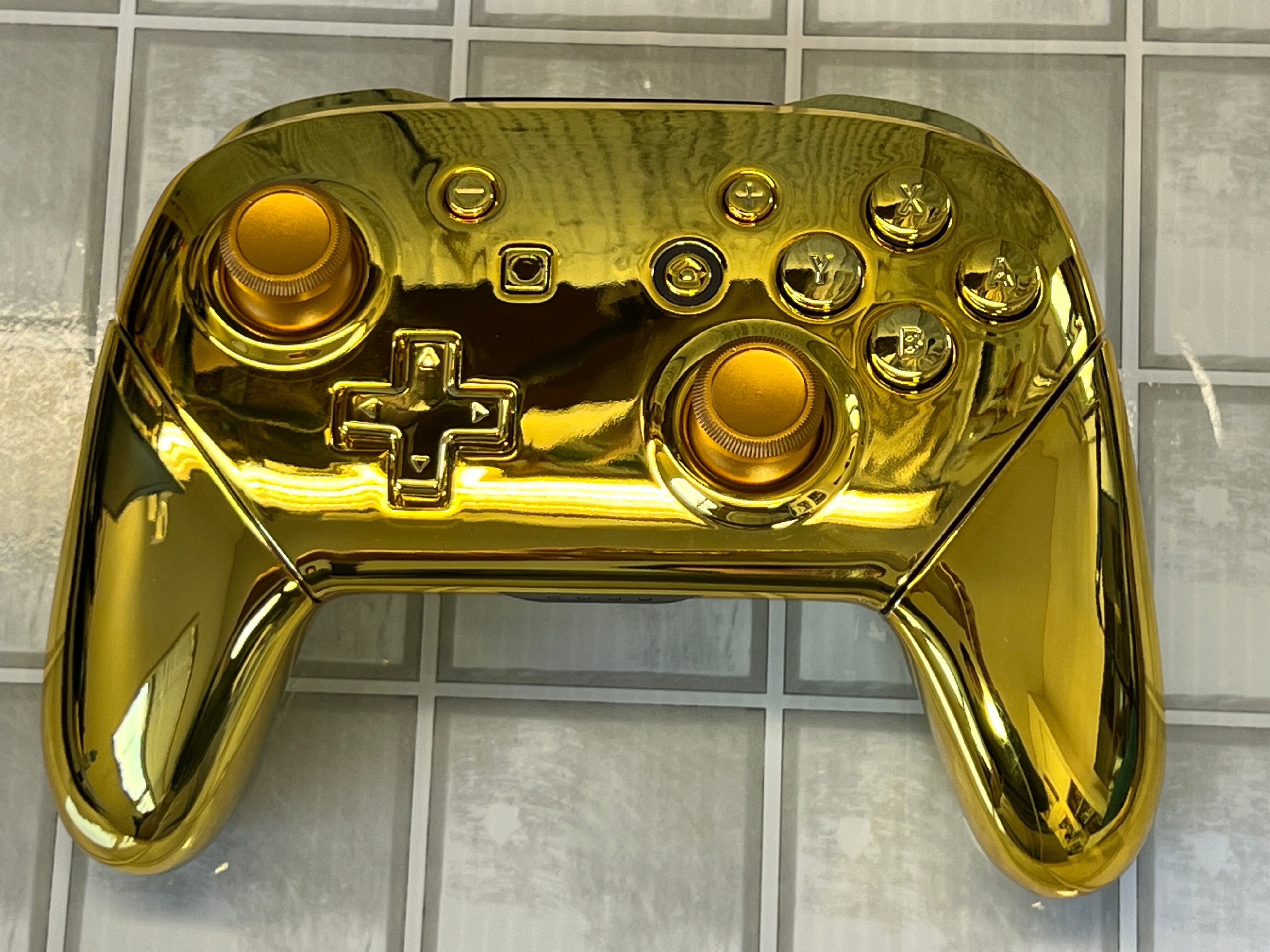 NintendoSwitchの純正プロコンを、eXtremeRate製のゴールドパーツに、両スティックをアルミ製のゴールドカラーに換装した商品になります。