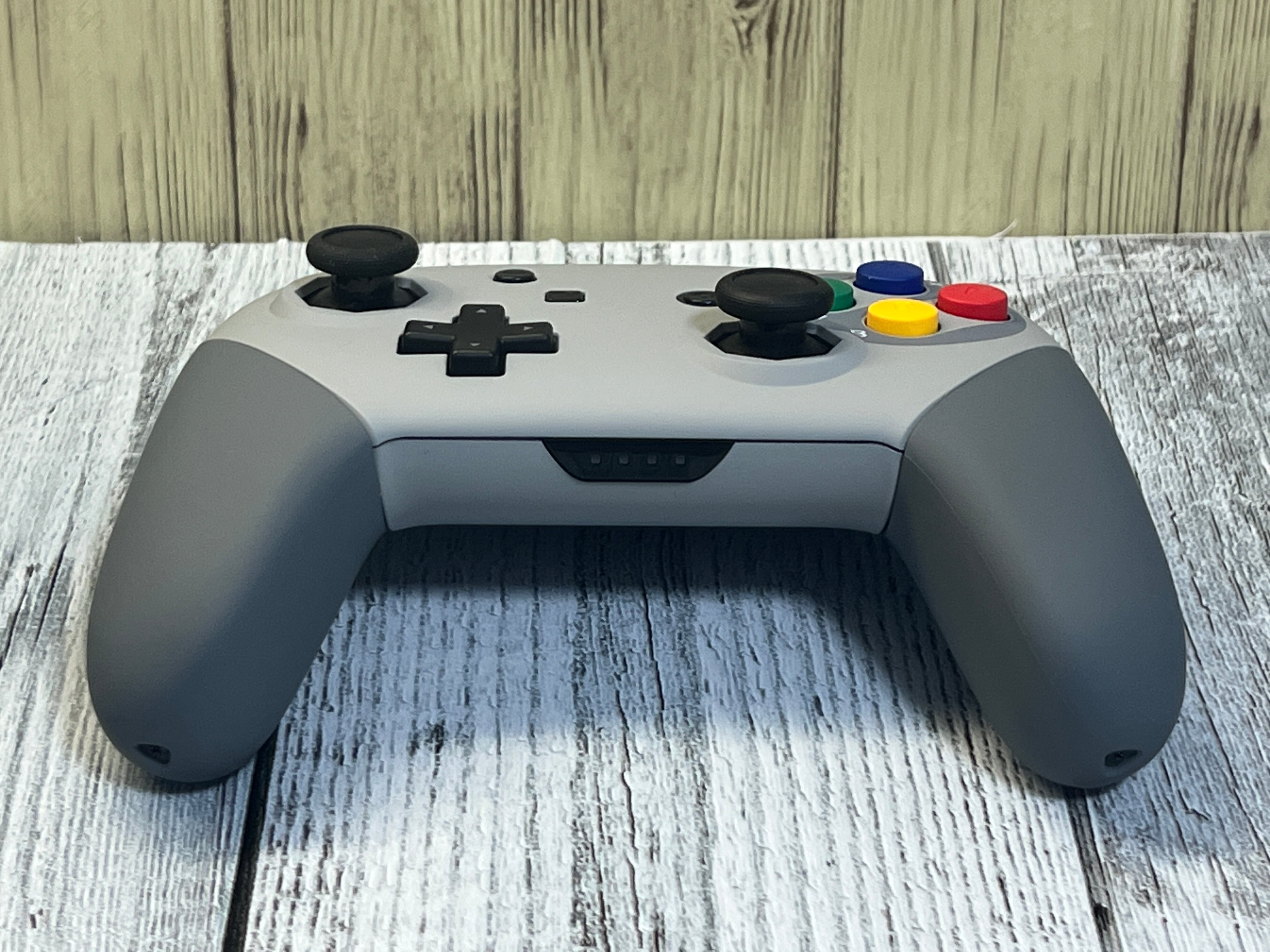 NintendoSwitchのプロコントローラー純正品のシェルを、eXtremeRate製のSFC クラシックカラーにカスタムした商品になります。特徴として、スティック周りが八角ゲートになっています。